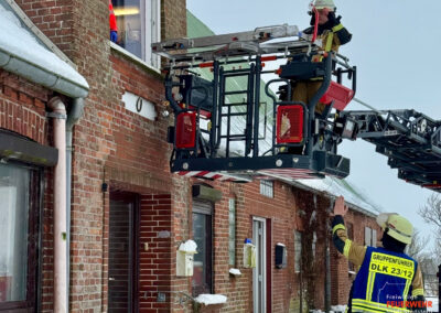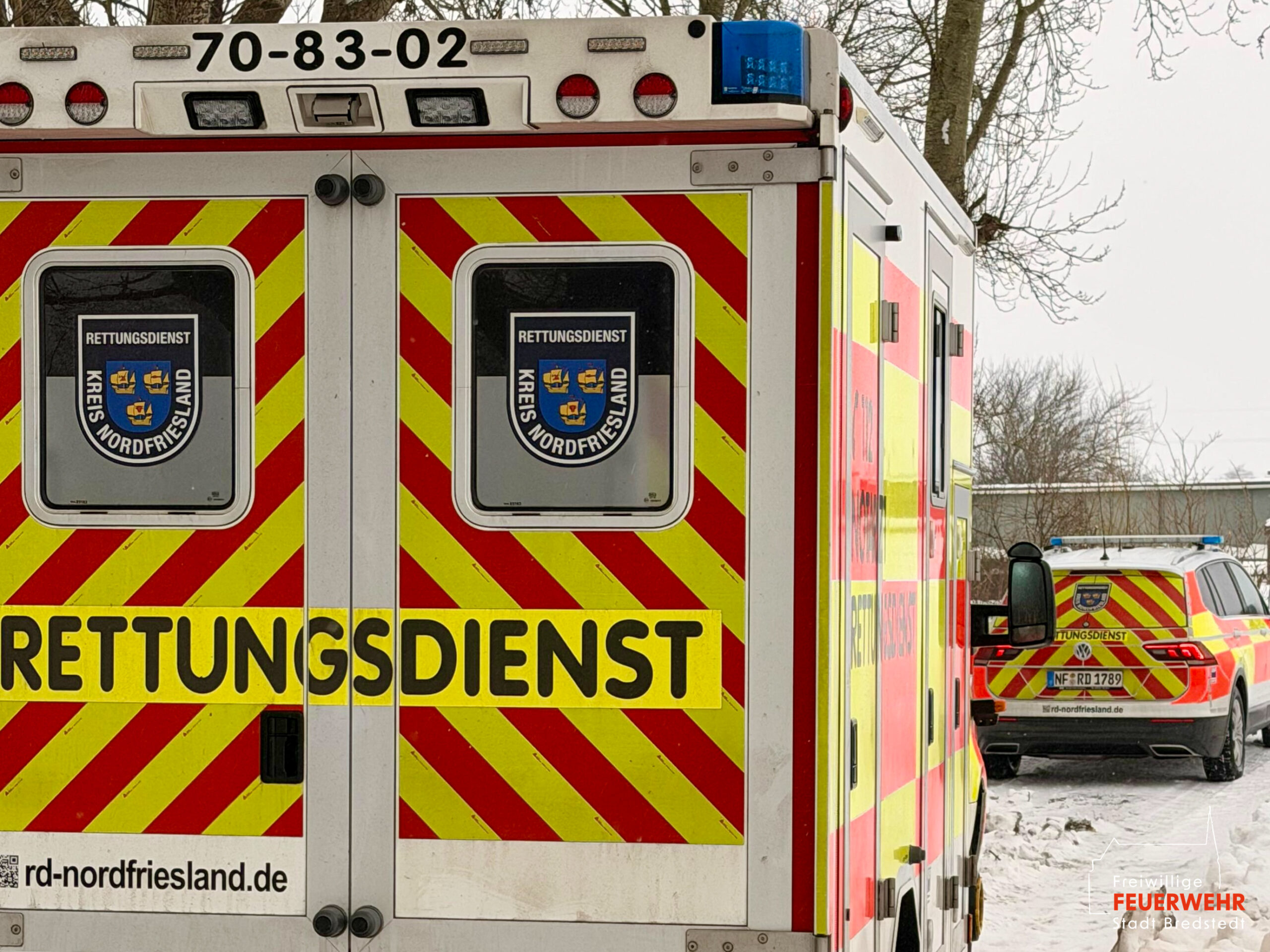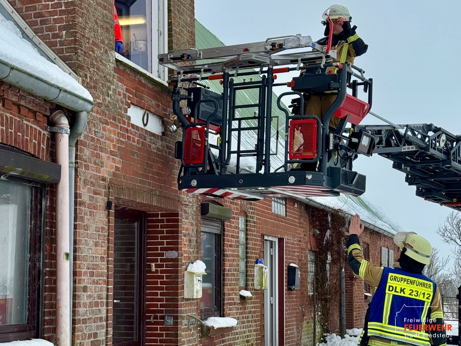 Vor Ort musste ein Patient mittels Drehleiter aus einem Wohngebäude gerettet werden. Das baulich beengte Treppenhaus bot keine adäquate Möglichkeit für den Patiententransport. Mit im Einsatz war die örtlich zuständige Feuerwehr aus der Hattstedter Marsch sowie ein Löschfahrzeug der Feuerwehr Hattstedt.