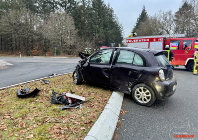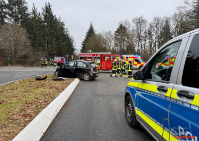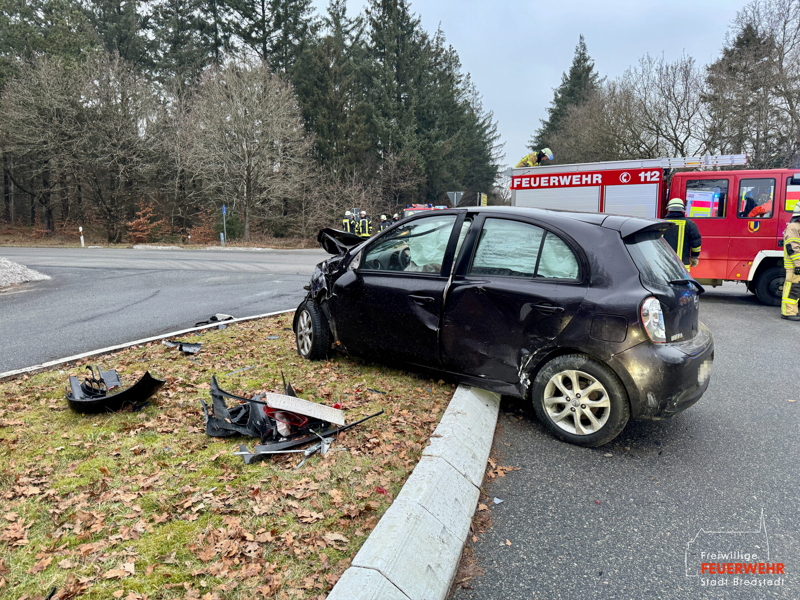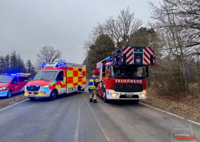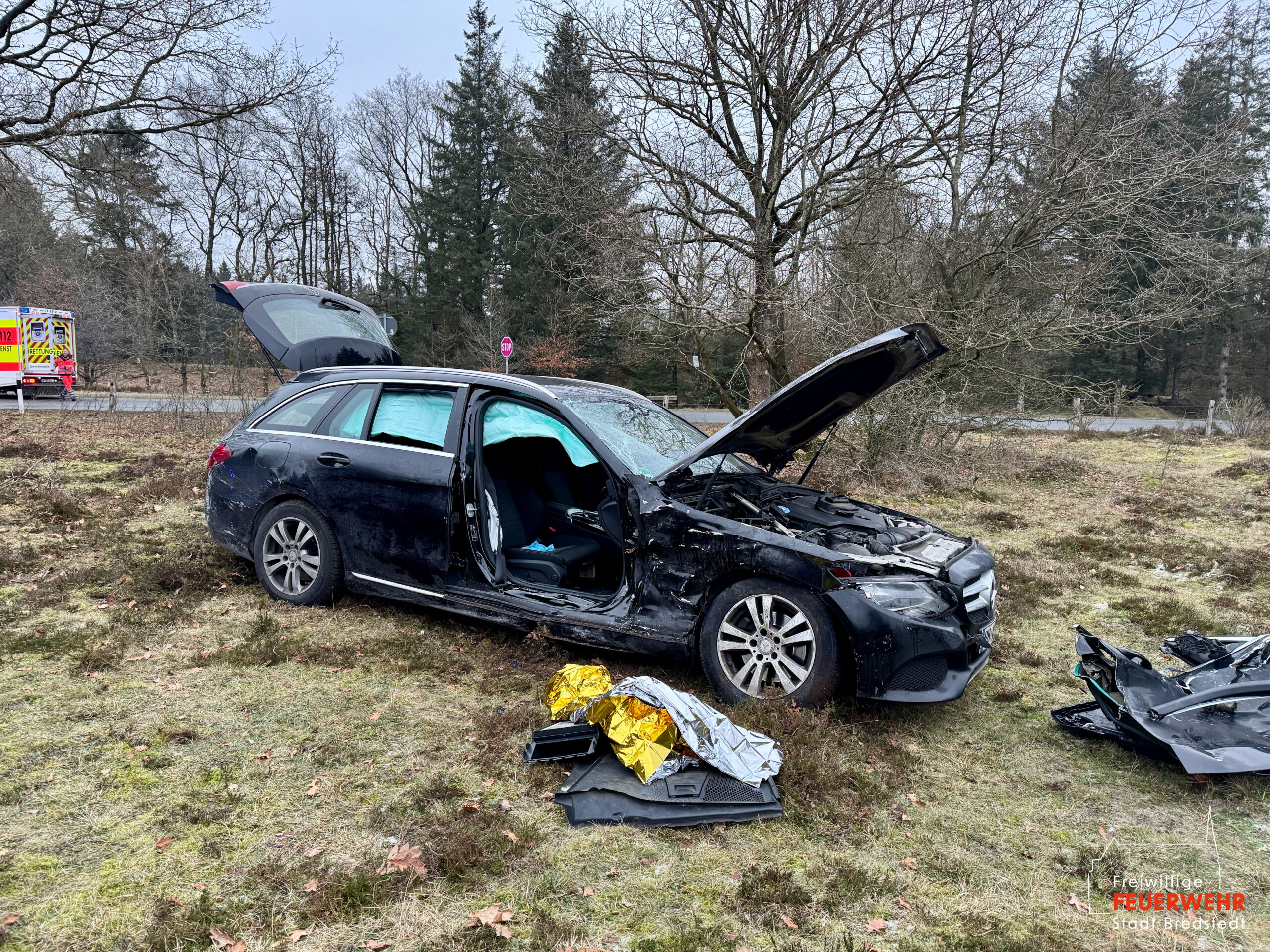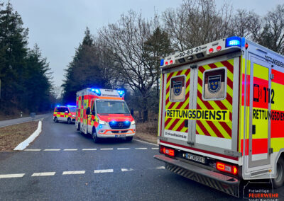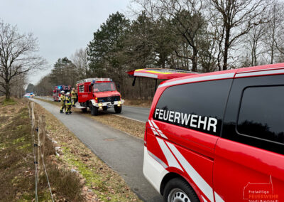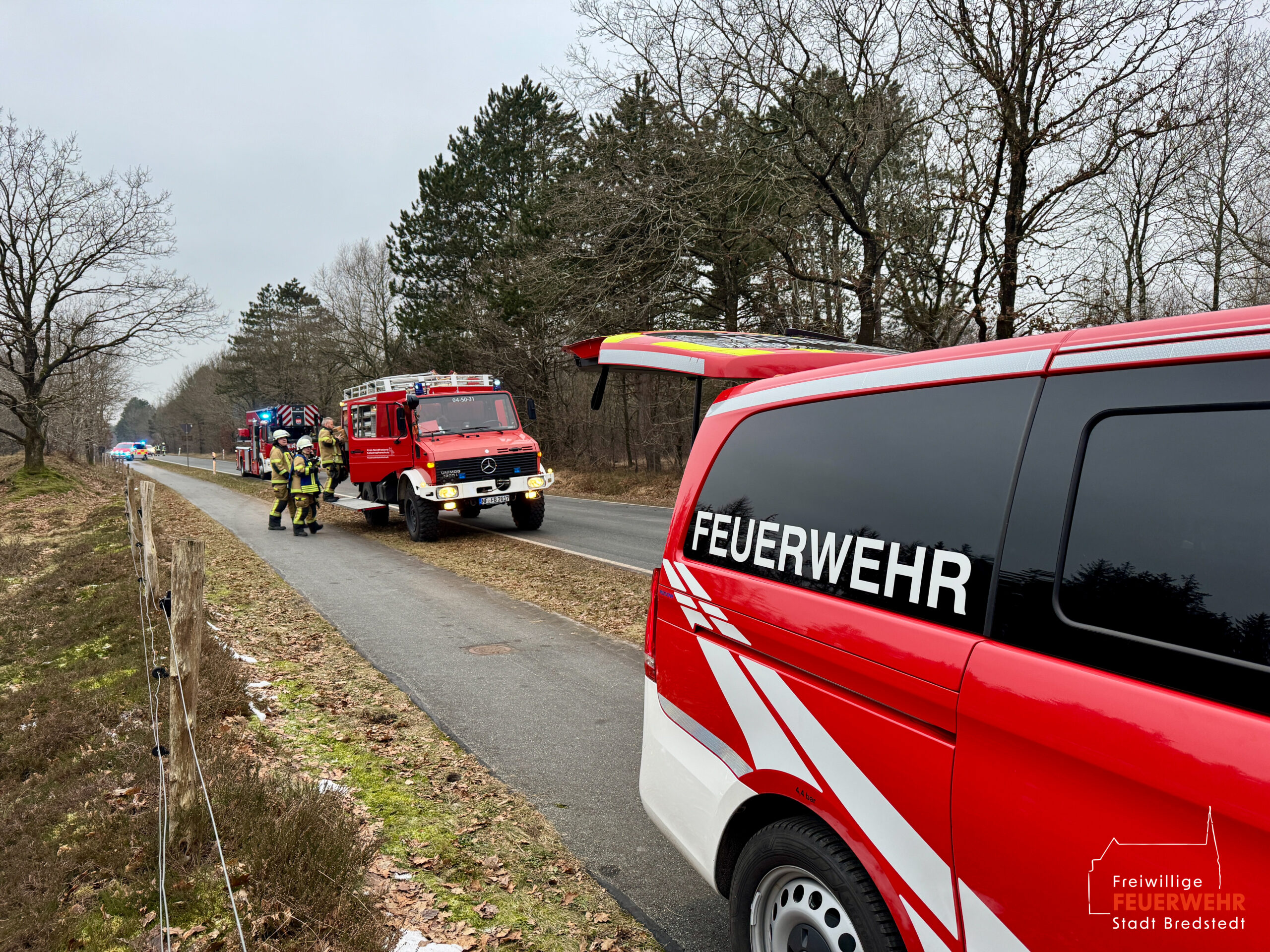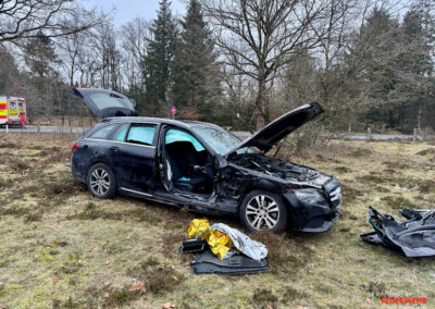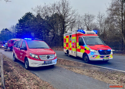 Vor Ort war es im Kreuzungsbereich zu einem Zusammenstoß zweier Kraftfahrzeuge gekommen. Dabei kam ein PKW stark deformiert abseits der Straße auf einer Heidefläche zum Stehen. Zum Zeitpunkt des Notrufs war die genaue Anzahl der Verletzten sowie der eingeklemmten Personen noch unklar, weshalb ein Großaufgebot des Rettungsdienstes alarmiert wurde. Gemeinsam mit der Feuerwehr Mönkebüll wurde die weitläufige Einsatzstelle erkundet und anschließend in Abschnitte aufgeteilt. In enger Absprache mit dem Rettungsdienst führten wir an einem der Unfallfahrzeuge eine patientengerechte Rettung mittels hydraulischem Rettungsgerät durch. Weitere an dem Unfall beteiligte Personen wurden bereits durch Ersthelfer betreut und anschließend an den Rettungsdienst übergeben. Nach umfangreicher medizinischer Versorgung wurden alle Verletzten in umliegende Krankenhäuser transportiert. Die Feuerwehr Bredstedt wurde nach Abschluss der Personenrettung aus dem Einsatz entlassen.