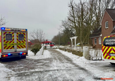 Wir wurden mit dem Stichwort NOTF 11 DLK (medizinischer Notfalleinsatz mit Notarzt, zusätzlich ein Hubrettungsmittel erforderlich) zur Unterstützung des Rettungsdienstes nach Bordelum alarmiert.