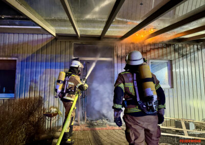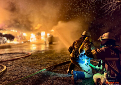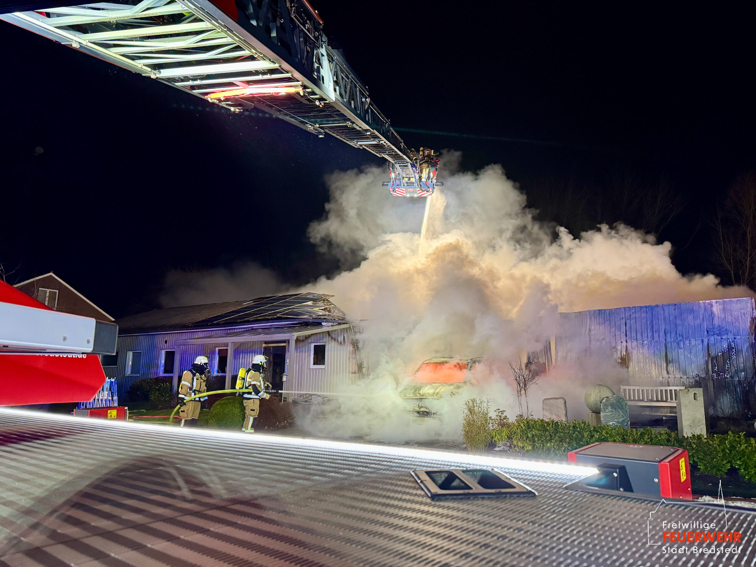 Vor Ort hatten Anrufer einen unklaren Feuerschein festgestellt und daraufhin die Notrufnummer 112 gewählt. Bereits auf der Anfahrt konnte die Leitstelle Nord die Einsatzadresse konkretisieren, da das Brandobjekt in Reichweite der örtlichen Bundespolizeidienststelle lag. Diese bestätigte einen Lagerhallenvollbrand; der grelle Feuerschein war bereits aus der Stadt gut zu erkennen. Aufgrund dieser Informationen ließ der Einsatzleiter das Stichwort noch während der Anfahrt auf FEU G (Feuer groß) erhöhen und die Feuerwehr Bordelum nachalarmieren. Die erste Erkundung zeigte einen Teilabschnitt des Hallenkomplexes in Vollbrand. Ein sich auf der Rückseite befindlicher oberirdischer Gastank war zeitweise von Flammen beaufschlagt und immenser Hitzestrahlung ausgesetzt, weshalb erste Trupps mit handgeführten Rohren eine Riegelstellung aufbauten. Parallel wurde die Drehleiter zur unmittelbaren Brandbekämpfung eingesetzt. Die Feuerwehr Bordelum unterstützte mit Atemschutzgeräteträgern und baute eine umfangreiche Wasserversorgung auf. Der Gastank konnte im Verlauf durch einen stationären Wasserwerfer dauerhaft gekühlt und geschützt werden. Weitere Trupps unter Atemschutz unterstützten die umfangreichen Löschmaßnahmen, während die Brandausbreitung an einer Brandschutzwand gestoppt wurde, sodass der Bürotrakt nahezu schadfrei gehalten werden konnte. Für die umfangreichen Nachlöscharbeiten wurden im Einsatzverlauf zusätzlich gezielt Atemschutzgeräteträger aus Breklum und Ost-Langenhorn nachgefordert. Die Feuerwehr Breklum unterstützte darüber hinaus mit ihrer Thermaldrohne bei der Suche nach Glutnestern unter der mittlerweile eingestürzten Hallenkonstruktion. Mithilfe eines Mobilbaggers konnten auch schwer erreichbare Hitzequellen freigelegt und abgelöscht werden. Die medizinische Absicherung der Einsatzkräfte übernahm anfänglich der Regelrettungsdienst, der im Verlauf durch Kräfte des DRK Bredstedt abgelöst wurde. Die Feuerwehr Bredstedt befand sich rund sechs Stunden im kontinuierlichen Einsatz.