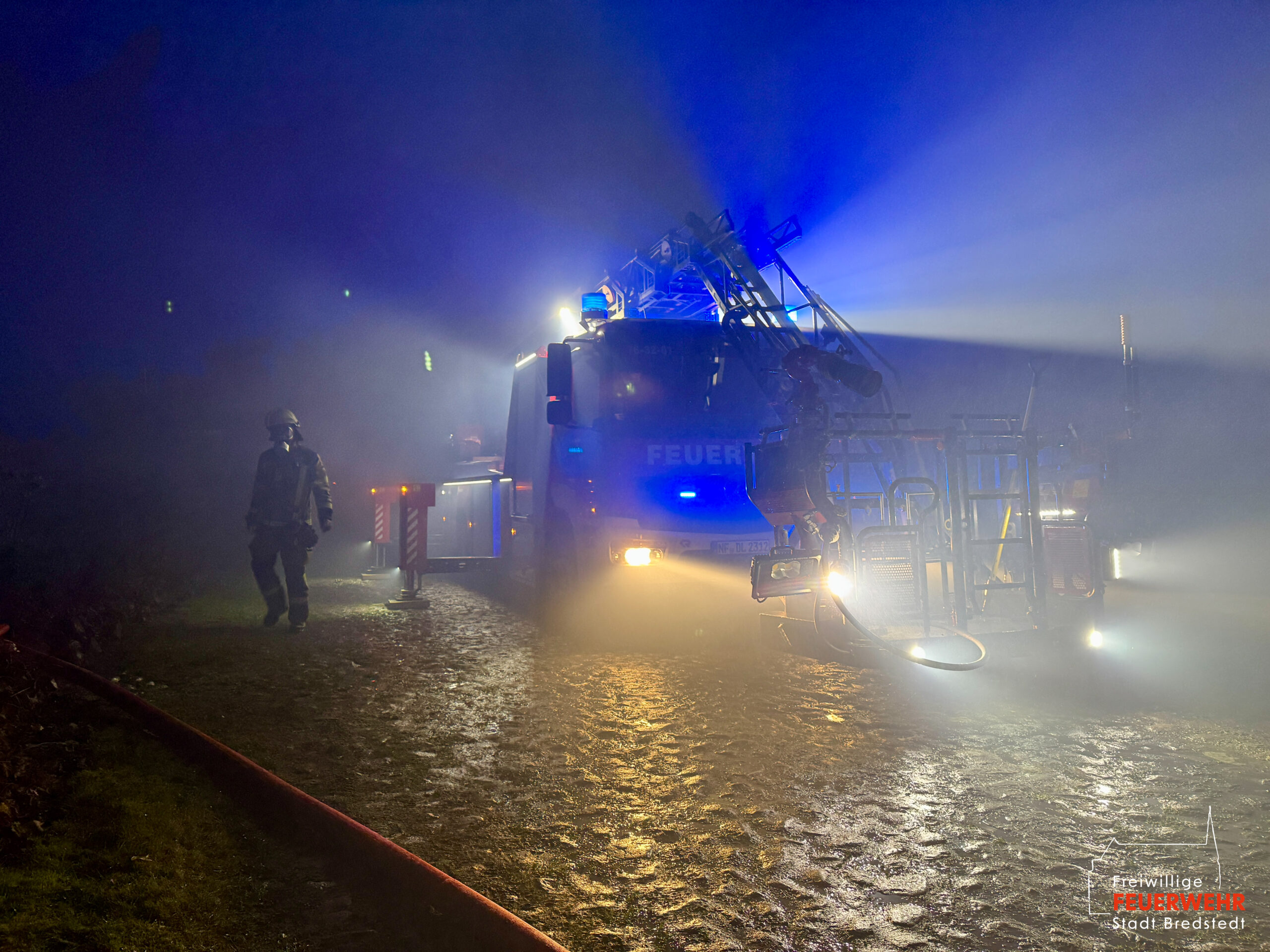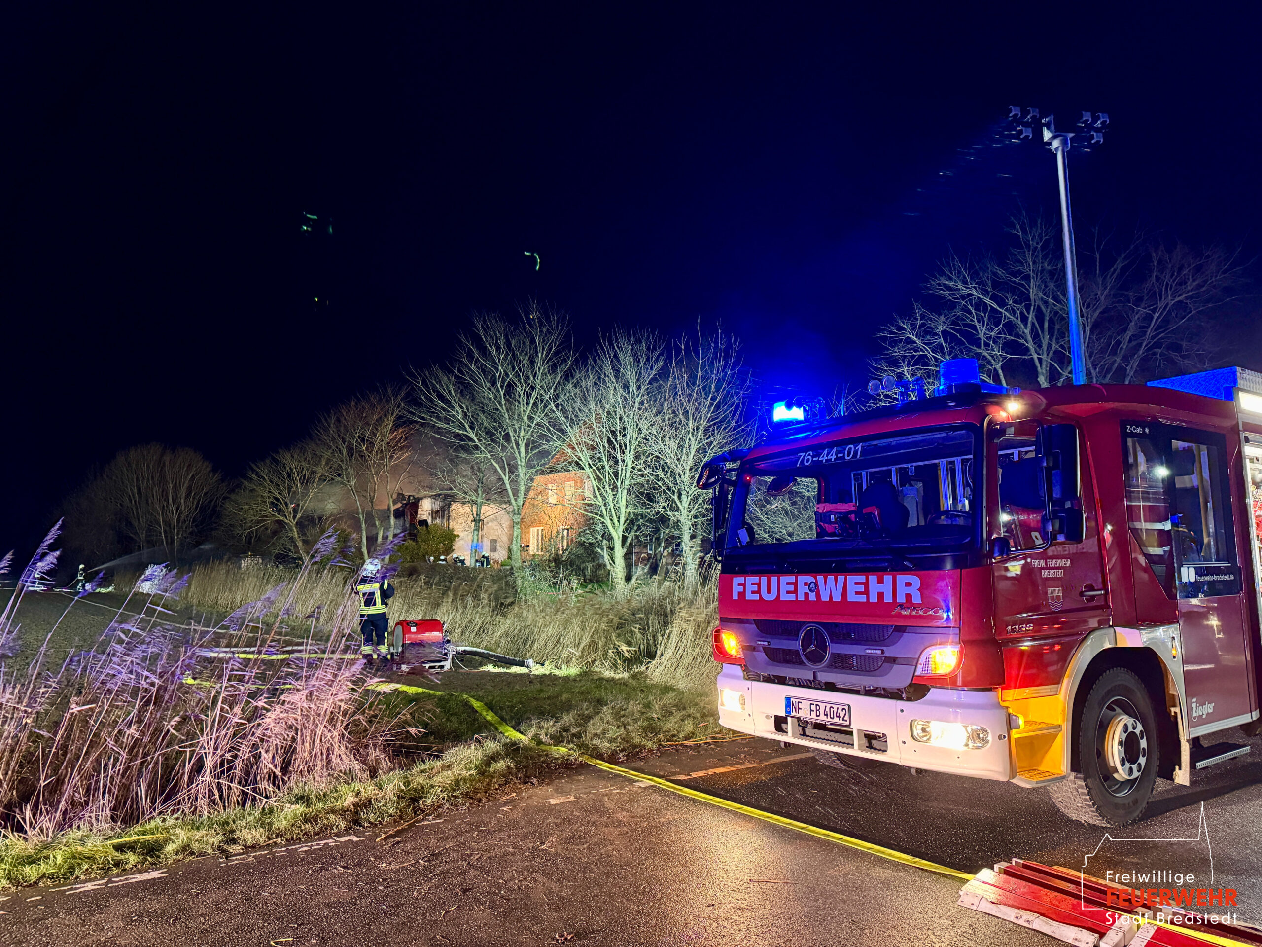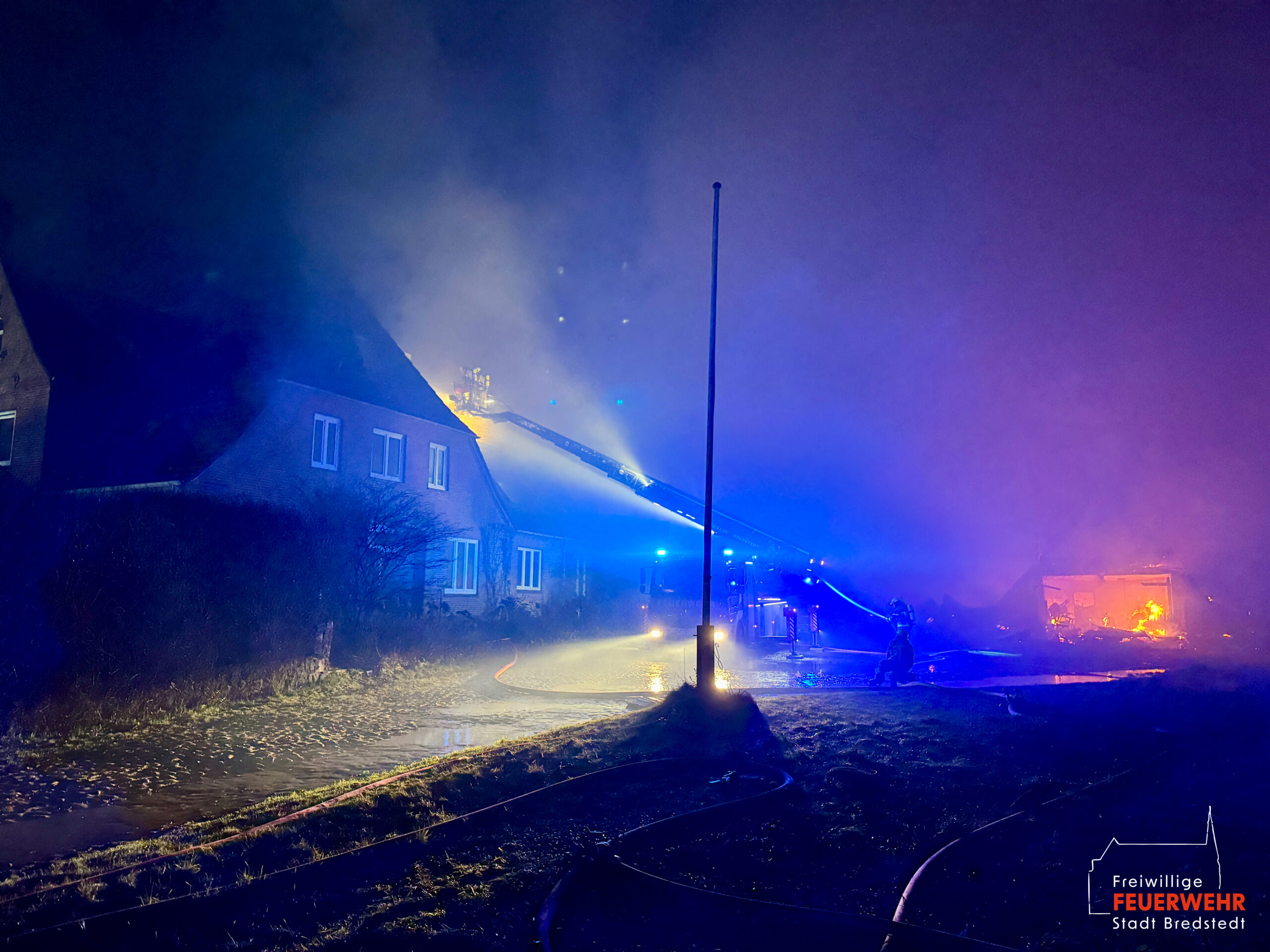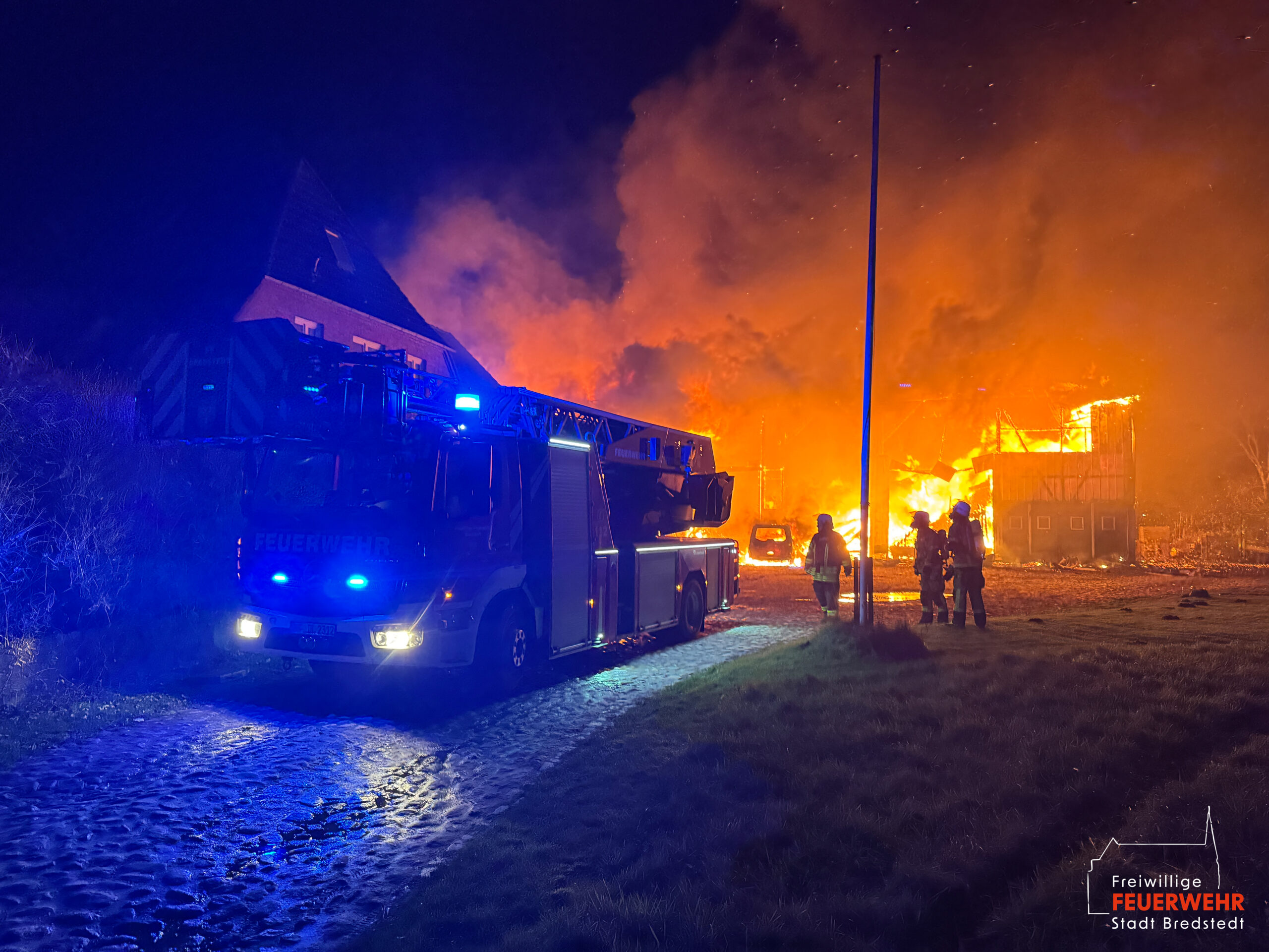 Vor Ort war ein landwirtschaftlicher Gebäudekomplex in Brand geraten. Bereits auf der Anfahrt zum Gerätehaus war für viele Bredstedter Einsatzkräfte innerhalb des Stadtgebietes massiver Brandgeruch sowie ein heller Feuerschein am Horizont wahrnehmbar gewesen. An der Einsatzstelle angekommen stand eine landwirtschaftlich genutzte Lagerhalle von rund 2.500qm in Vollbrand, ein unmittelbar angrenzendes Wohngebäude war akut gefährdet und bereits mit Feuer beaufschlagt. Aufgrund der Brandintensität und geringen Löschwasserversorgung wurde das Einsatzstichwort von Feuer groß auf Feuer 2 erhöht und die Feuerwehr Bordelum mit Vollalarm sowie die Feuerwehr Hattstedt-Wobbenbüll mit der Komponente Wasserförderung nachalarmiert. Durch die Feuerwehr Bredstedt wurde eine Riegelstellung zwischen Wohngebäude und Lagerhalle vorgenommen. Aufgrund der intensiven Wärmestrahlung war ein direktes Vorgehen vorerst nicht möglich. Die Korbbesatzung der Drehleiter musst unter Verwendung der Selbstschutzanlage aus der Distanz vorgehen, ein am Boden geführtes C-Rohr wurde ebenfalls zum Selbstschutz der Drehleiter eingesetzt, ein weiteres Rohr kühlte die Giebelseite des Hauses.