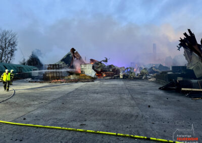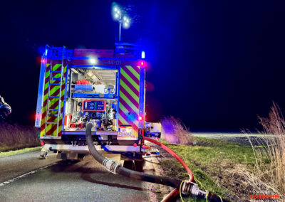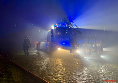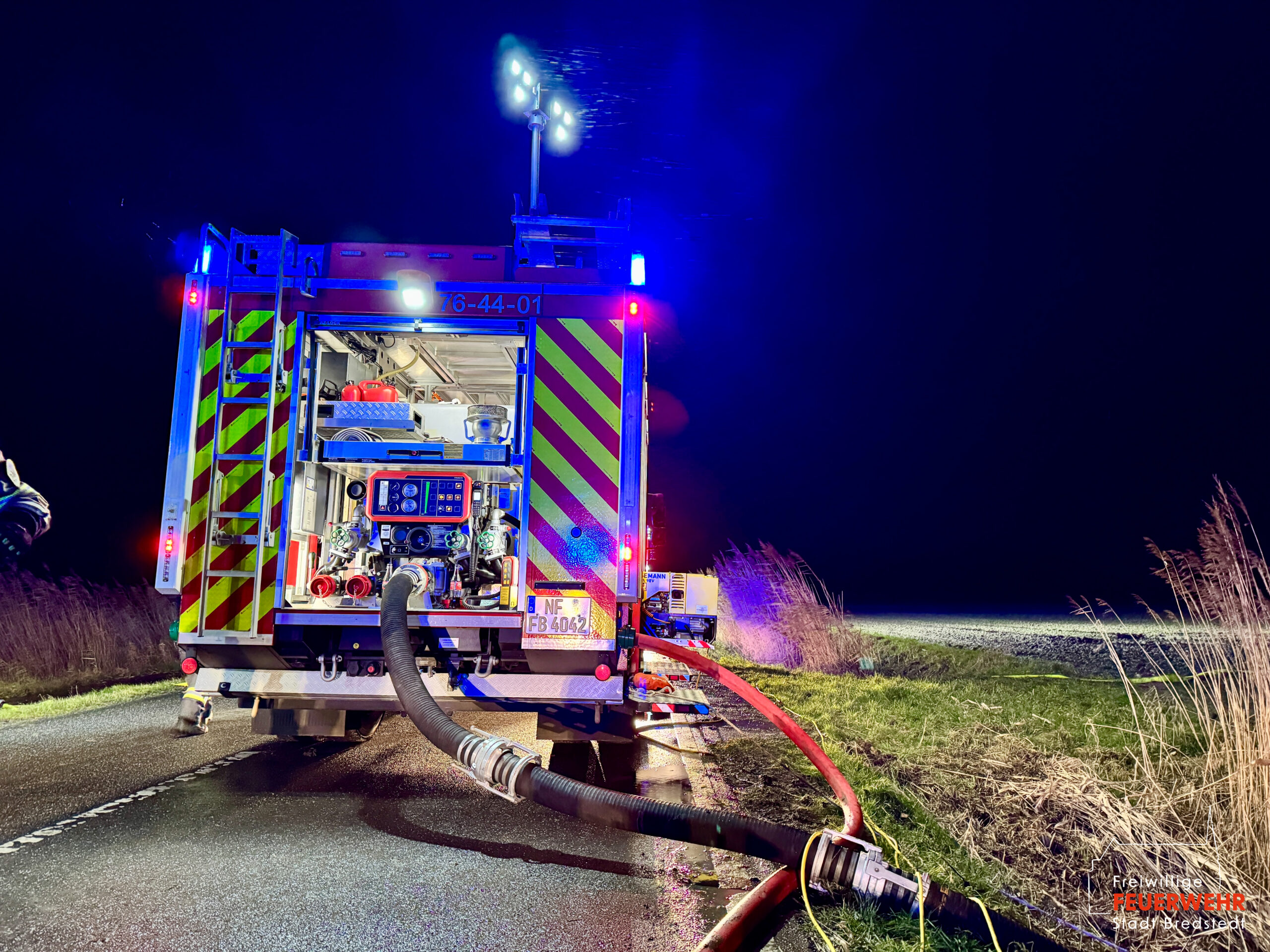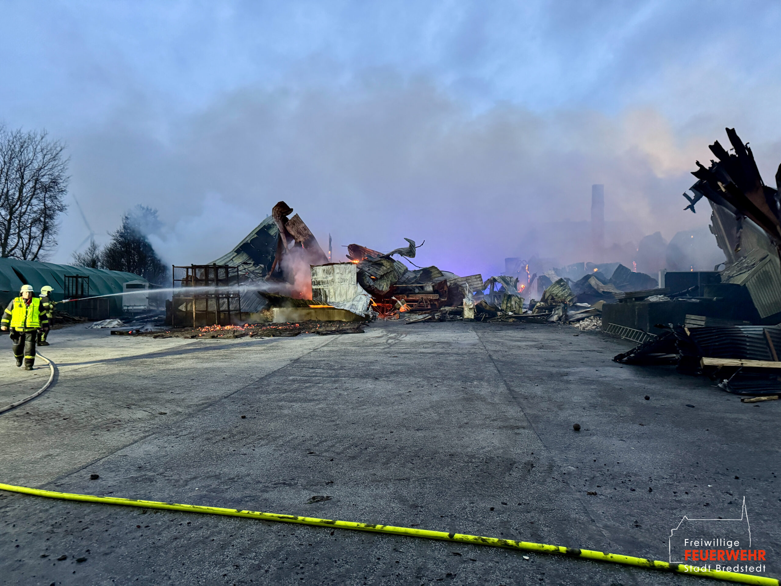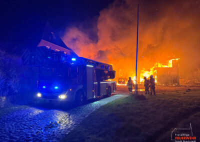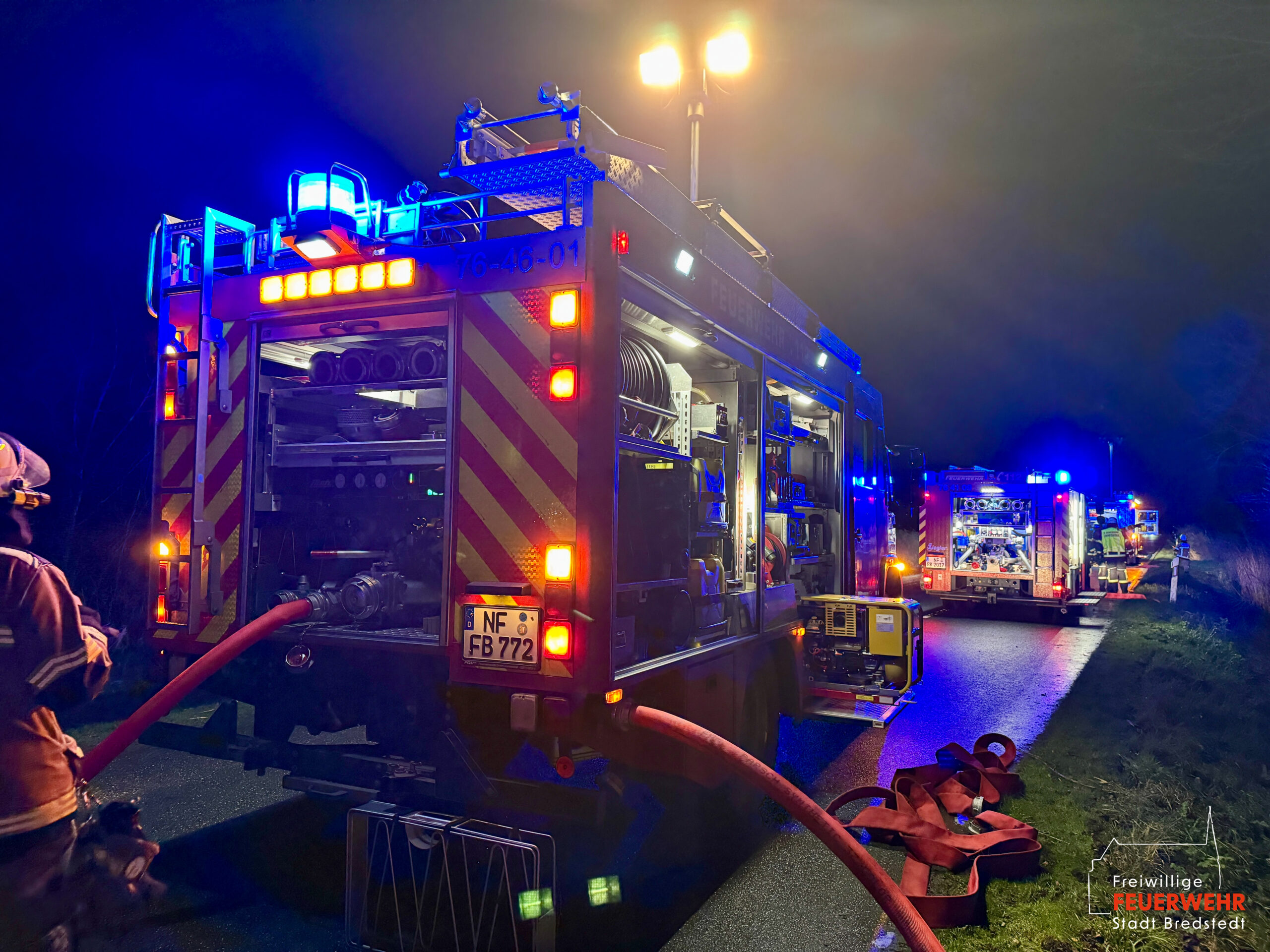 Vor Ort war ein landwirtschaftlicher Gebäudekomplex in Brand geraten. Bereits auf der Anfahrt zum Gerätehaus war für viele Bredstedter Einsatzkräfte innerhalb des Stadtgebietes massiver Brandgeruch sowie ein heller Feuerschein am Horizont wahrnehmbar gewesen. An der Einsatzstelle angekommen stand eine landwirtschaftlich genutzte Lagerhalle von rund 2.500qm in Vollbrand, ein unmittelbar angrenzendes Wohngebäude war akut gefährdet und bereits mit Feuer beaufschlagt. Aufgrund der Brandintensität und geringen Löschwasserversorgung wurde das Einsatzstichwort von Feuer groß auf Feuer 2 erhöht und die Feuerwehr Bordelum mit Vollalarm sowie die Feuerwehr Hattstedt-Wobbenbüll mit der Komponente Wasserförderung nachalarmiert. Durch die Feuerwehr Bredstedt wurde eine Riegelstellung zwischen Wohngebäude und Lagerhalle vorgenommen. Aufgrund der intensiven Wärmestrahlung war ein direktes Vorgehen vorerst nicht möglich. Die Korbbesatzung der Drehleiter musst unter Verwendung der Selbstschutzanlage aus der Distanz vorgehen, ein am Boden geführtes C-Rohr wurde ebenfalls zum Selbstschutz der Drehleiter eingesetzt, ein weiteres Rohr kühlte die Giebelseite des Hauses.