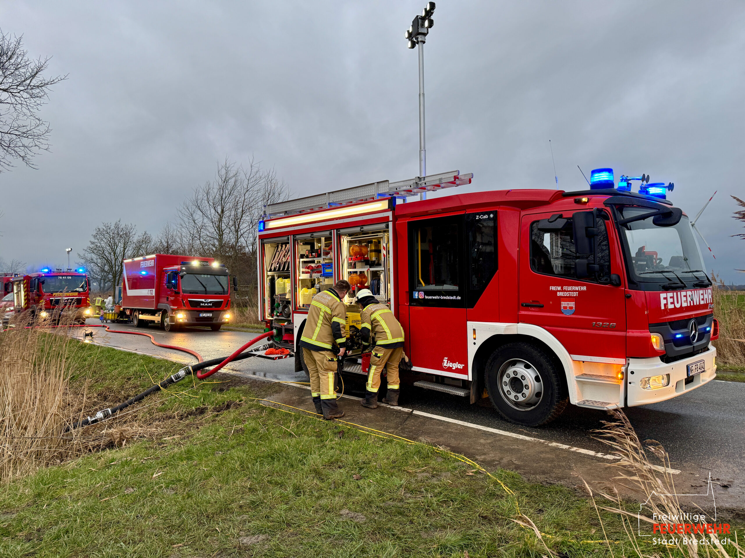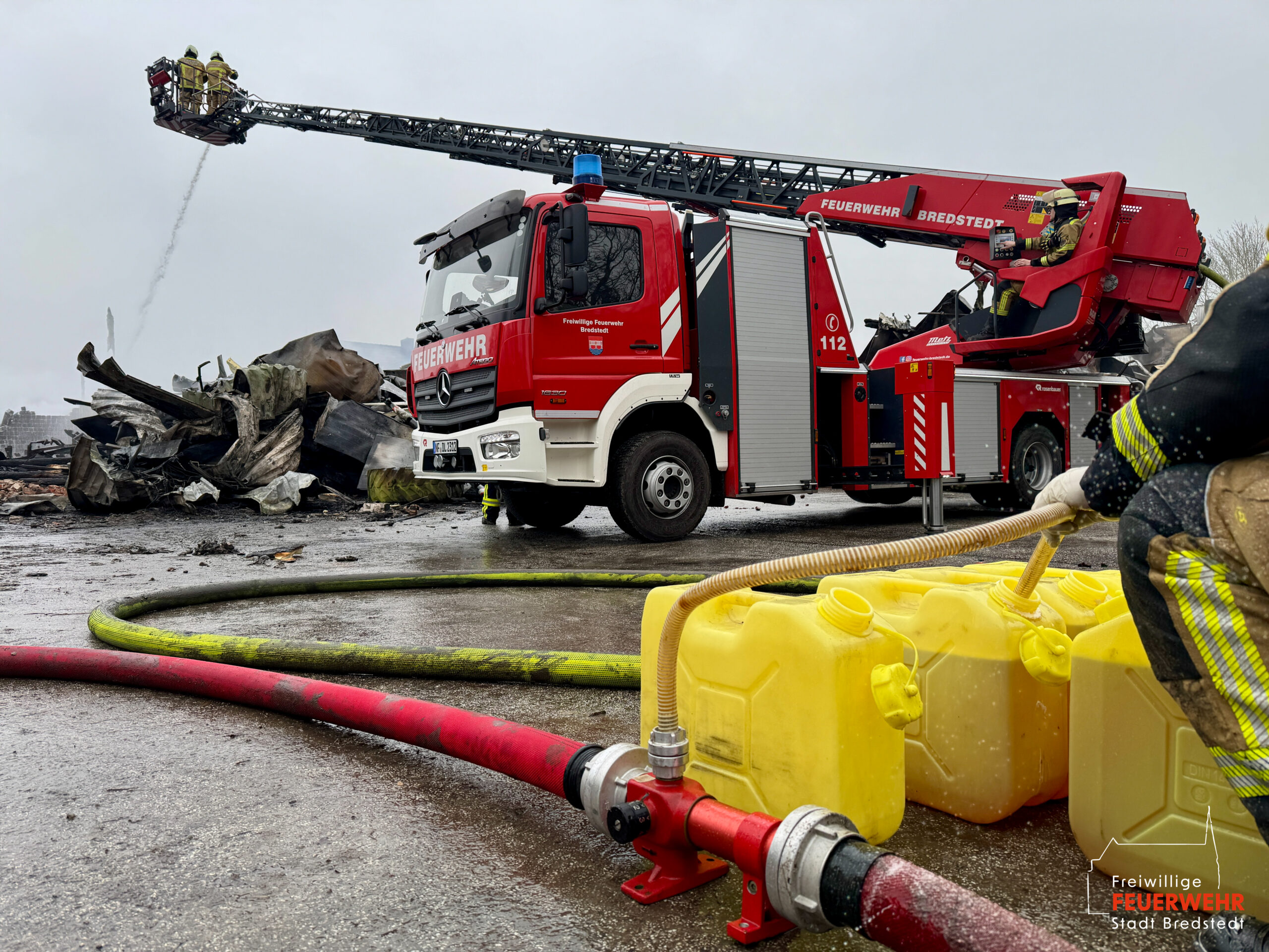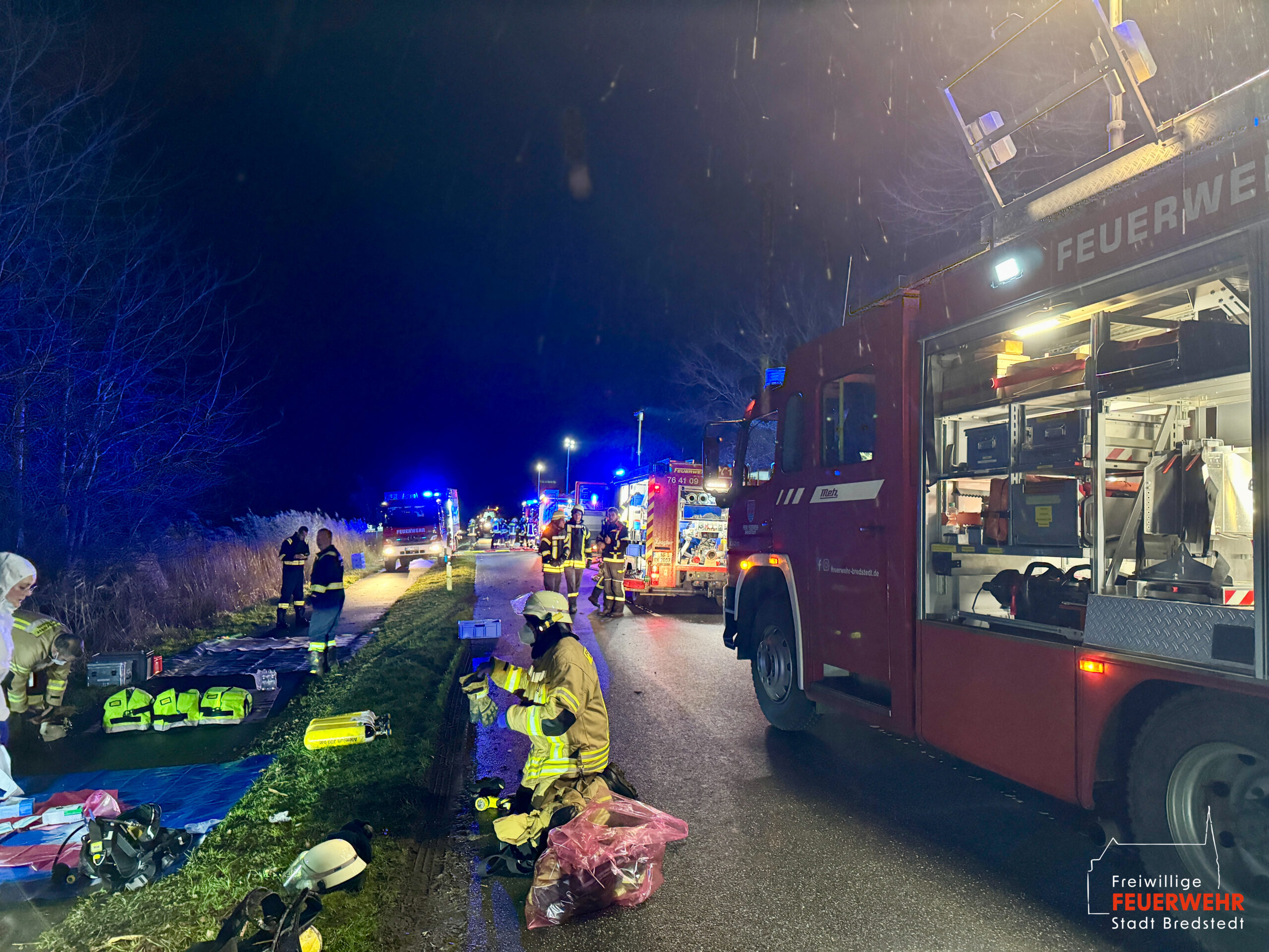 Die Feuerwehr Bredstedt befand sich zu Spitzenzeiten mit insgesamt 7 Einsatzfahrzeugen für rund 9 Stunden im kontinuierlichen Einsatz, die nötigsten Säuberungsarbeiten an Fahrzeugen und Gerätschaften erforderten weitere drei Stunden nach dem Verlassen der Einsatzstelle.