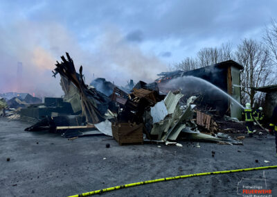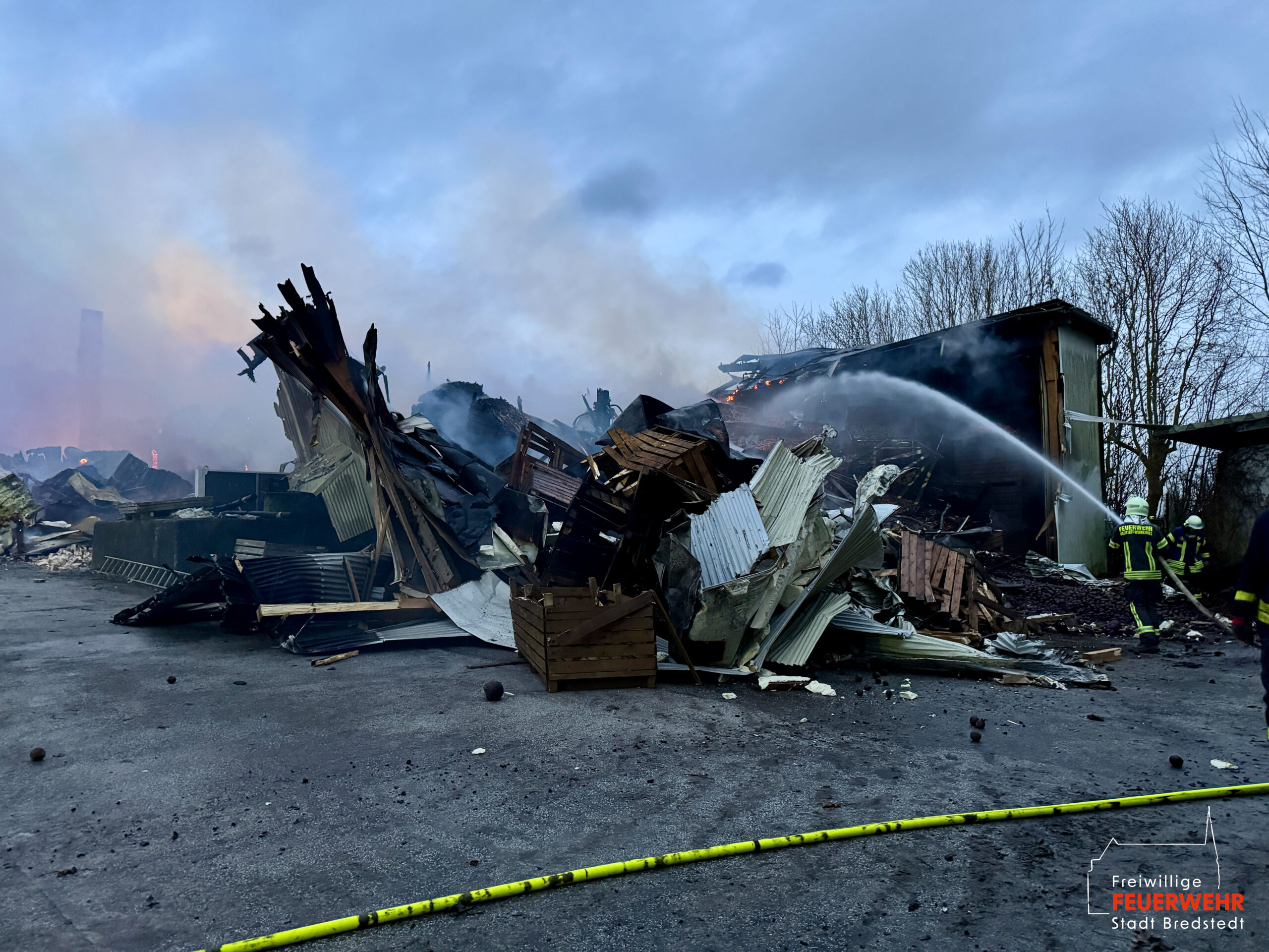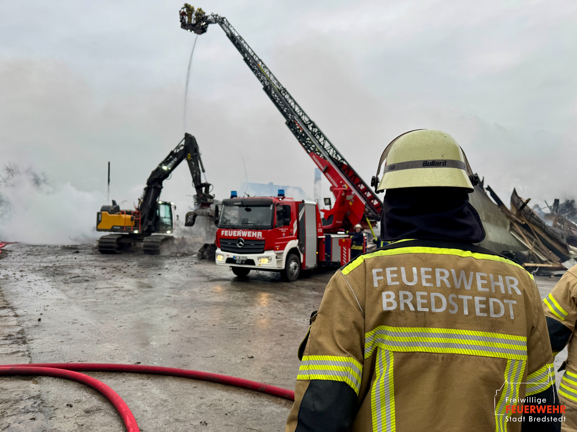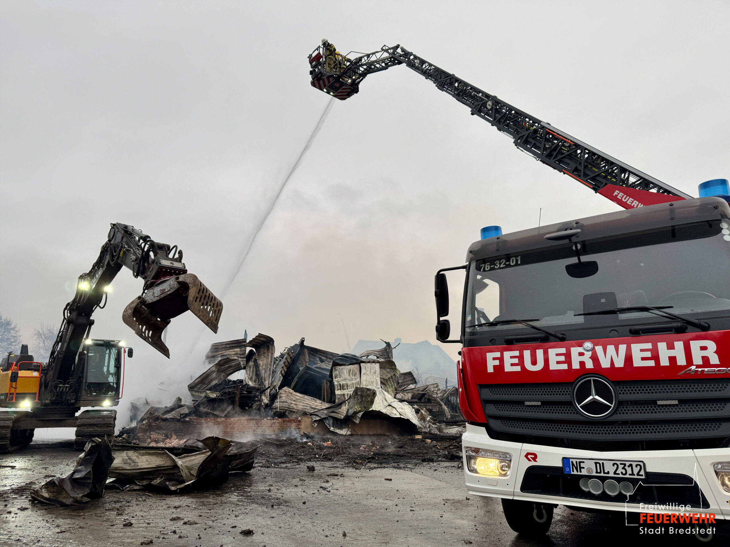 Für die umfangreichen Nachlöscharbeiten wurden zwei Bagger privater Unternehmen angefordert, welche die Trümmer und Schuttberge der abgebrannten Lagerhalle auseinanderzogen. Die Maßnahmen wurde durch das Wenderohr der Drehleiter sowie mehrerer handgeführter Rohre unterstützt. Als abschließende Handlung wurde die Einsatzstelle mit Netzmittel (Gemisch aus Wasser und Schaummittel) eingedeckt, um eine höhere Eindringtiefe in das Brandgut erwirken zu können. Bei mittlerweile nur noch mäßiger Rauchentwicklung konnten die Nachlöscharbeiten unter Verwendung von Filtergeräten durchgeführten werden, um die sich in Reserve befindlichen Einsatzkräfte zu schonen. Während der Naschlöscharbeiten kam es im Bredstedter Stadtgebiet zu einem Paralleleinsatz mit der Nachforderung einer Drehleiter zur Unterstützung des Rettungsdienstes. Der Einsatz konnte durch die Feuerwehr aus Husum übernommen und abgearbeitet werden.