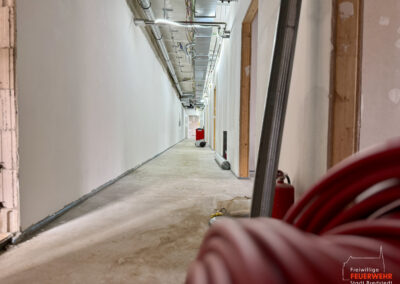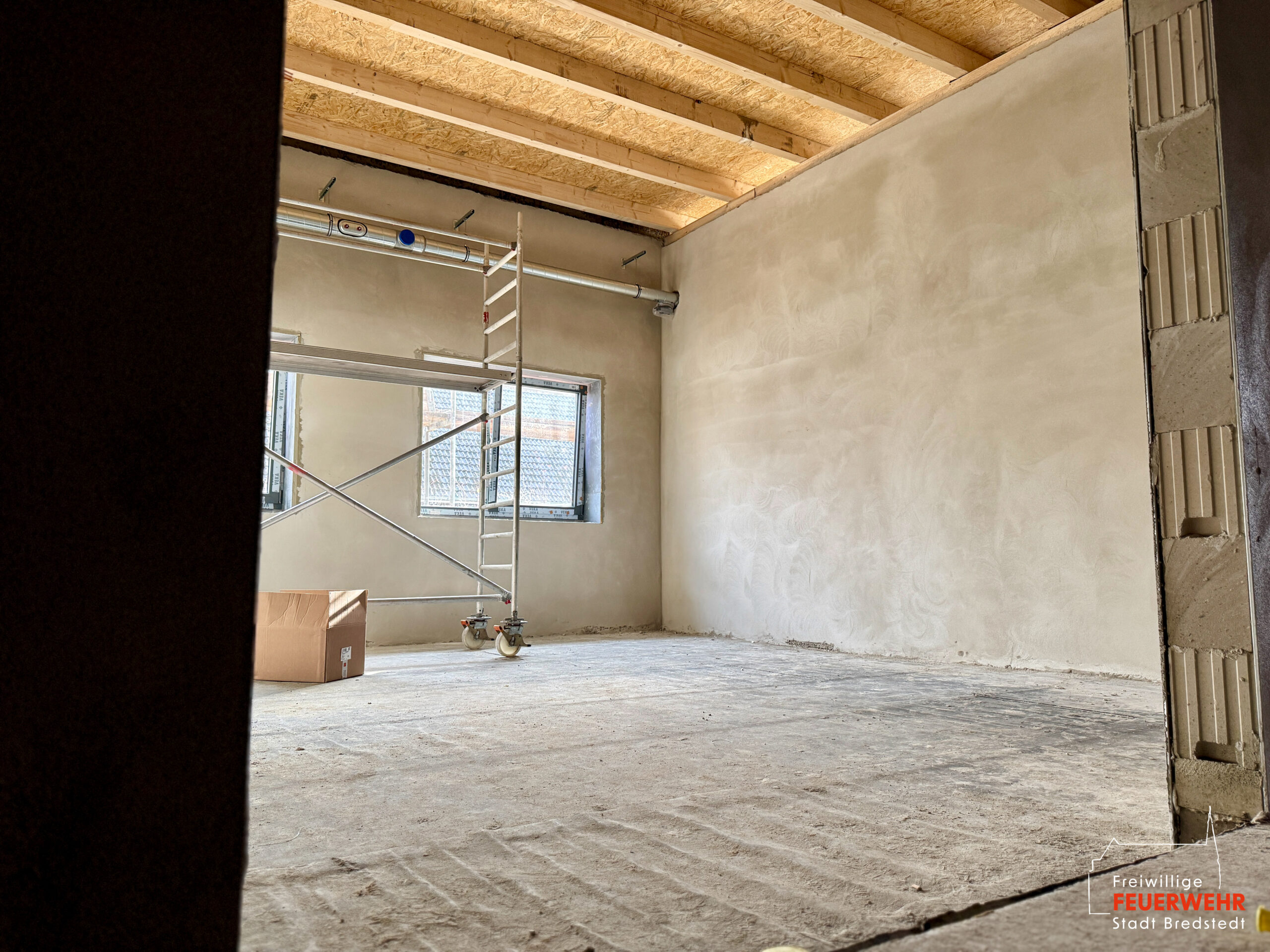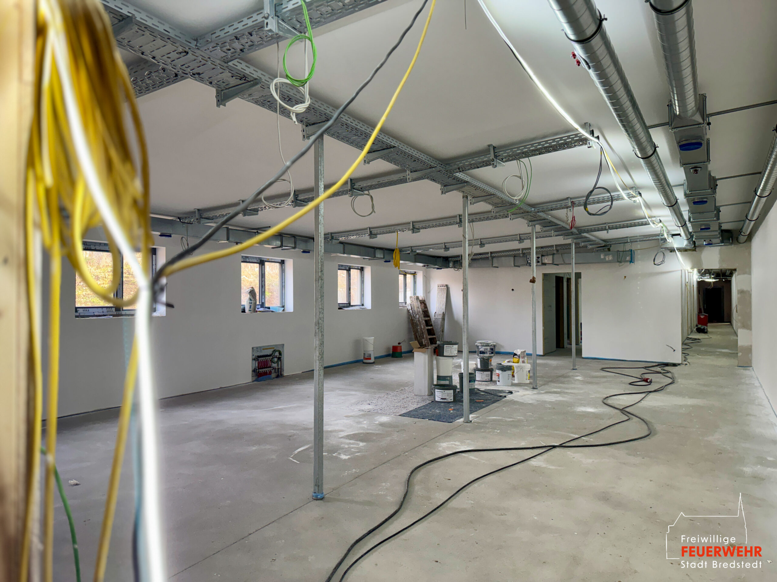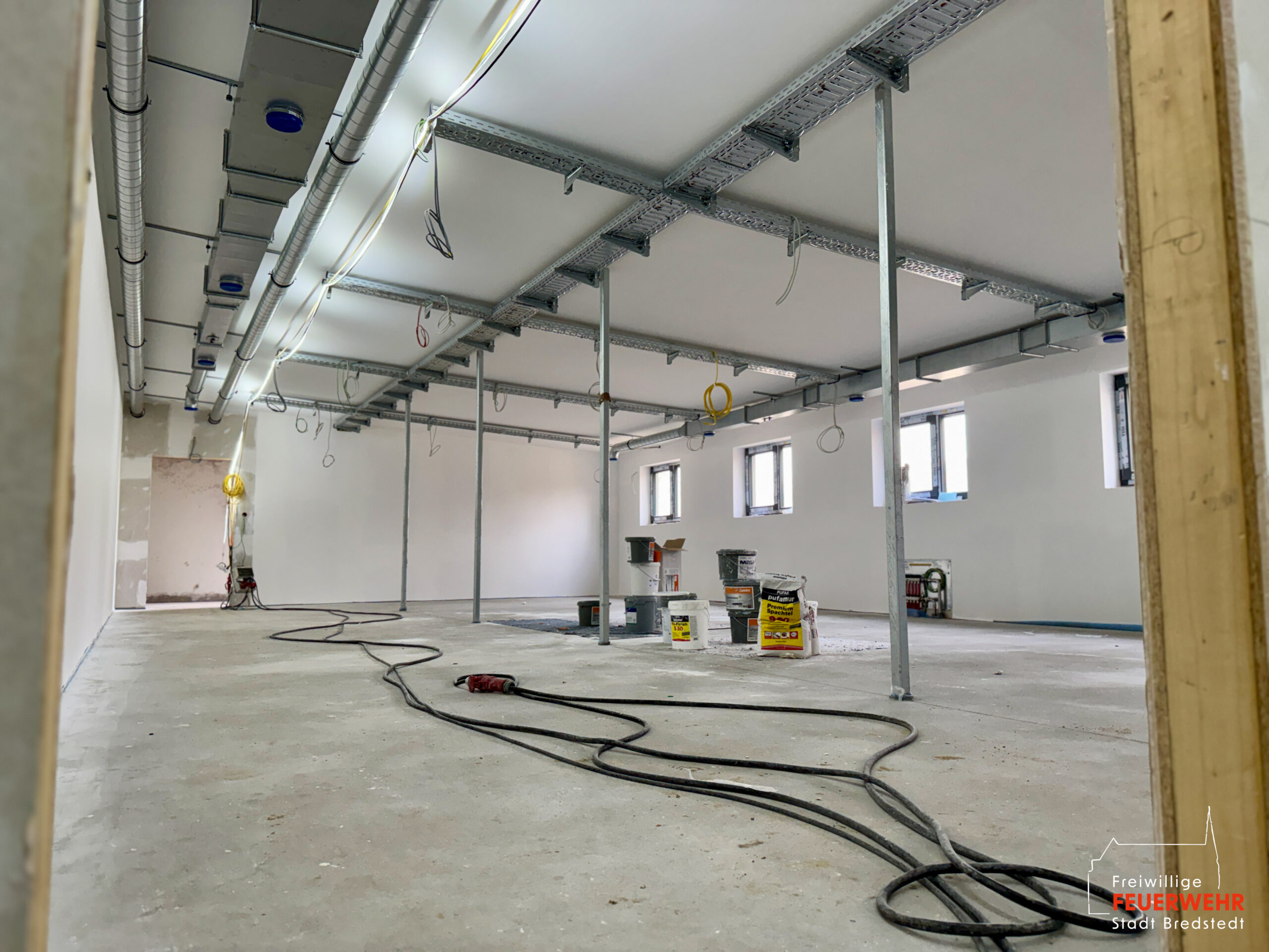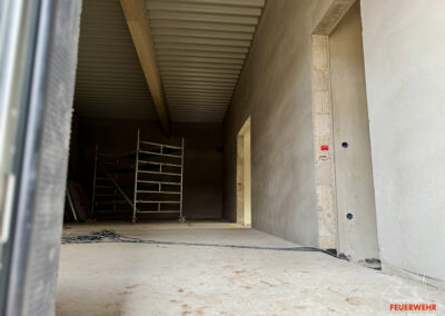 Fahrzeugstellplatz Nummer 8 sowie die angrenzenden Räumlichkeiten sind verputzt und für die weiteren Bauschritte vorbereitet worden. Mit etwas Vorstellungsvermögen kann man auch schon im neuen Einsatzleitraum „Platz nehmen“ und die ausrückenden Fahrzeuge vor dem inneren Auge bestaunen.