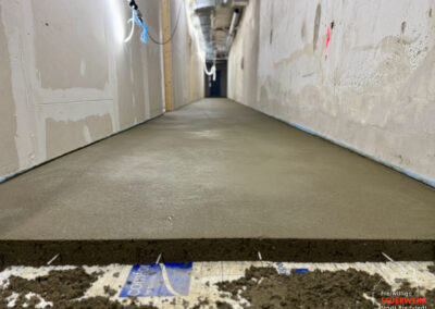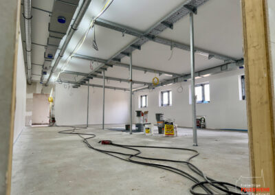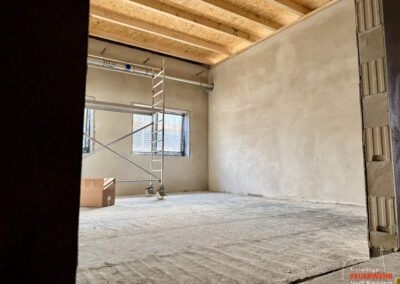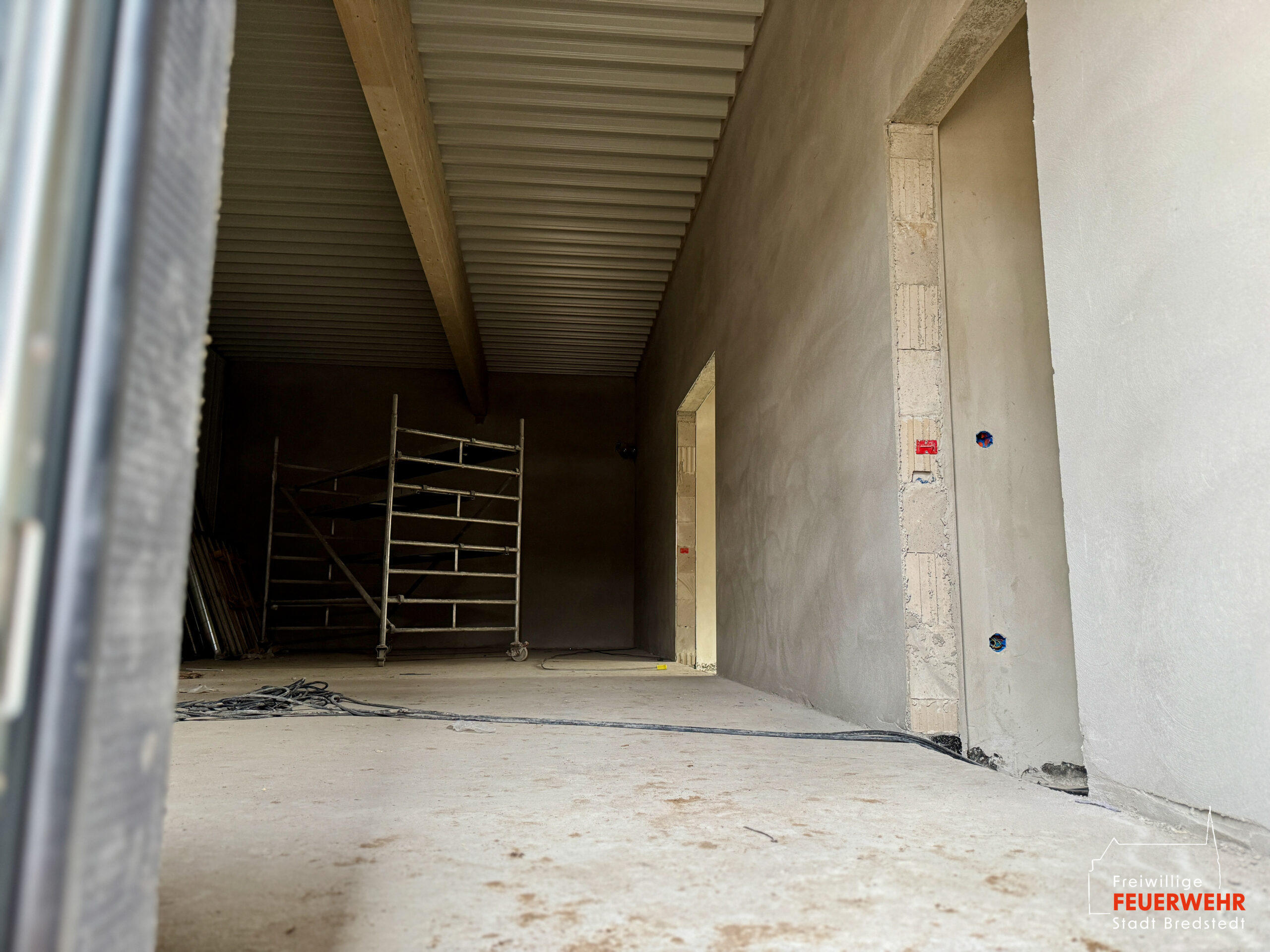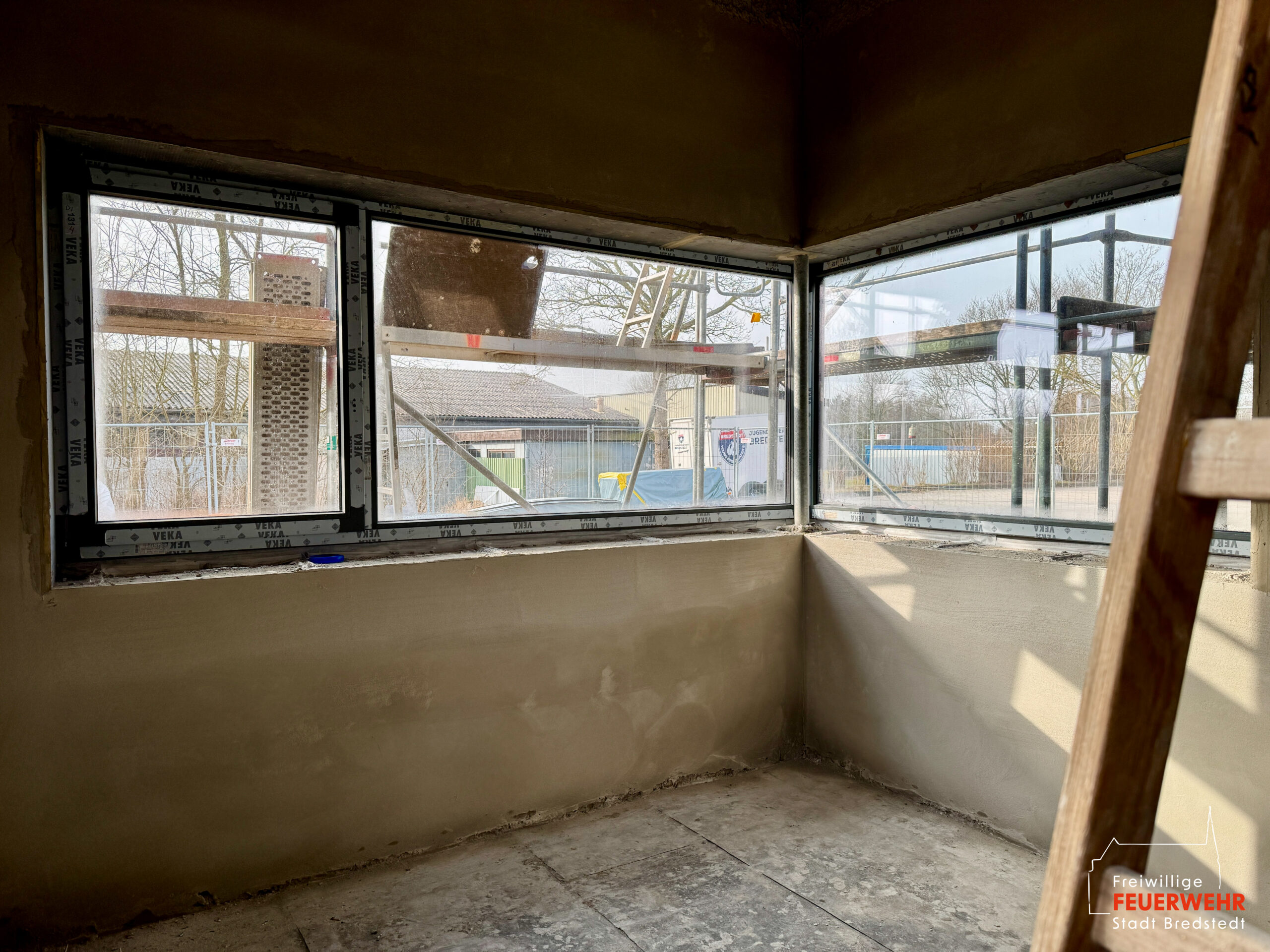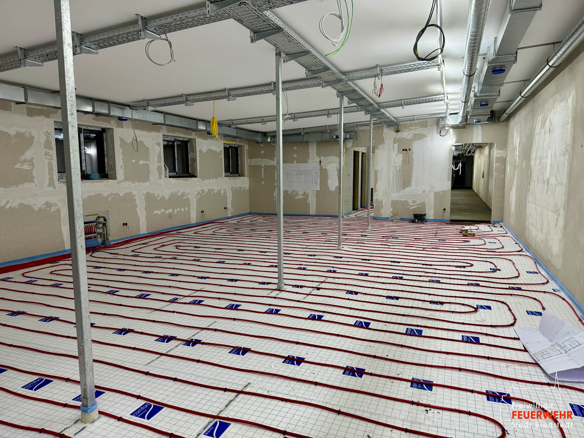 Fahrzeugstellplatz Nummer 8 sowie die angrenzenden Räumlichkeiten sind verputzt und für die weiteren Bauschritte vorbereitet worden. Mit etwas Vorstellungsvermögen kann man auch schon im neuen Einsatzleitraum „Platz nehmen“ und die ausrückenden Fahrzeuge vor dem inneren Auge bestaunen.