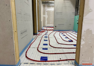Die Fußbodenheizung ist verlegt und der darüberliegende Estrich ausgebracht worden. Auch die Lüftungsschächte sind endmontiert. Mittlerweile haben sich die Maler breitgemacht und mit der Wandbearbeitung begonnen. In einigen Räumen ist die glatte Vliestapete bereits gut sichtbar.