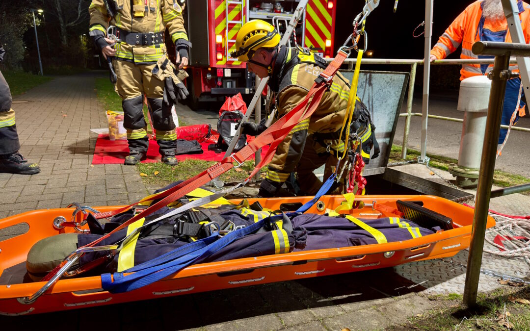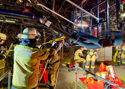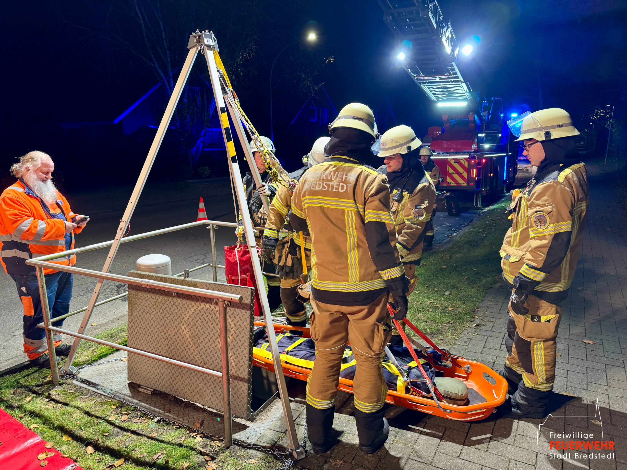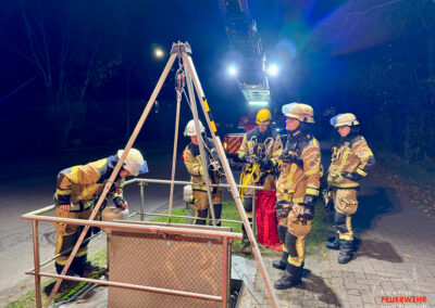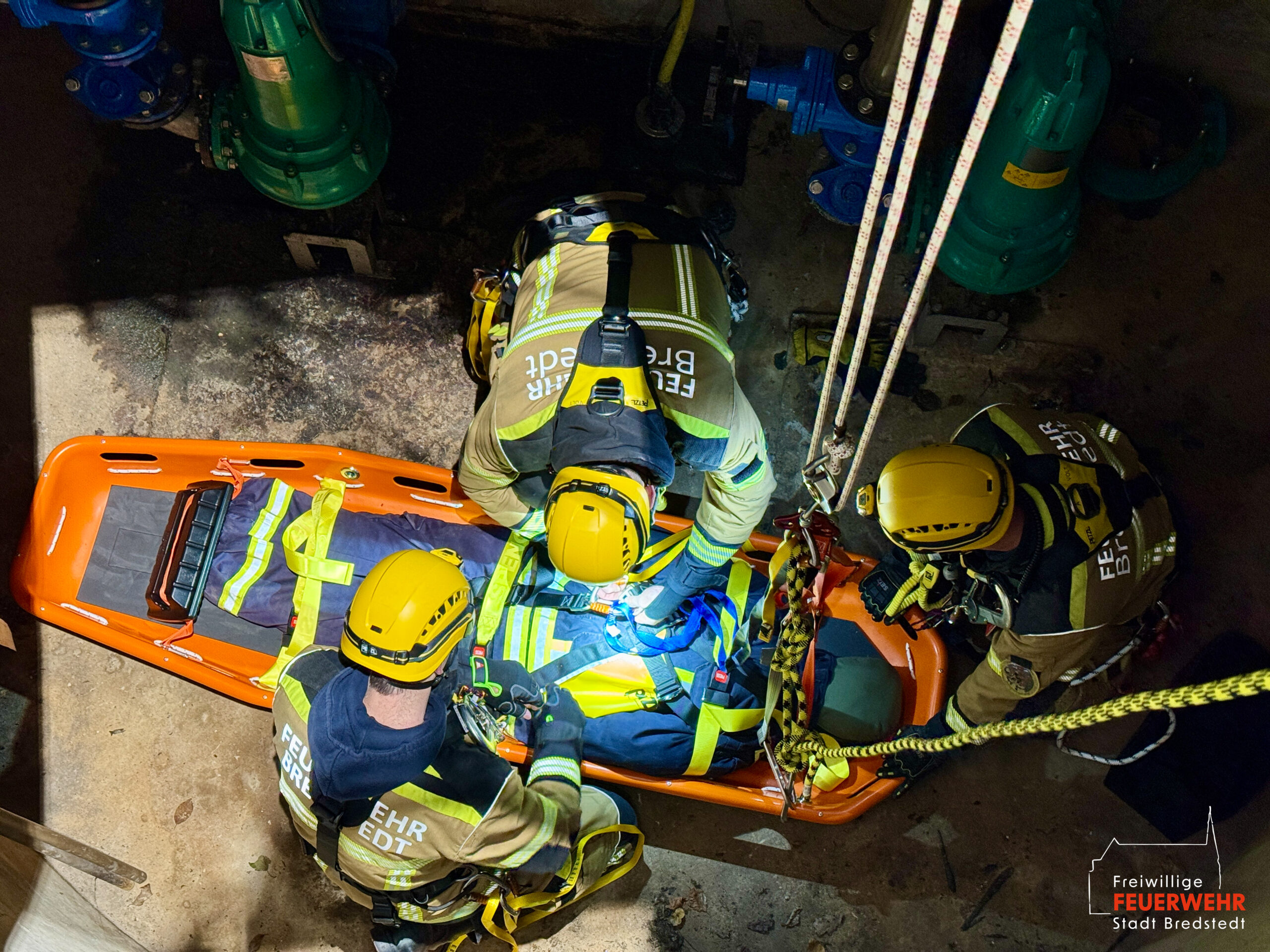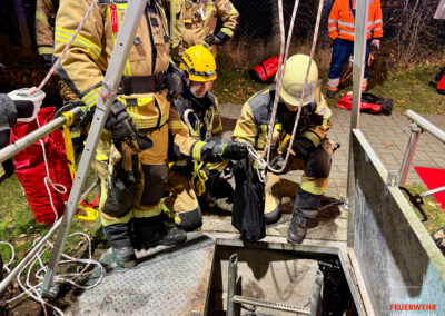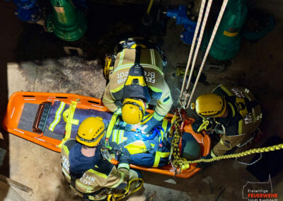 In der dortigen unterirdischen Pumpstation verunfallte ein Mitarbeiter so schwer, dass eine Rettung durch den Leiterschacht erforderlich wurde. Mittels Abseil- und Rettungsgeräten konnte die verletzte Person versorgt und anschließend in einer Schleifkorbtrage vertikal aus der Pumpstation gerettet werden.